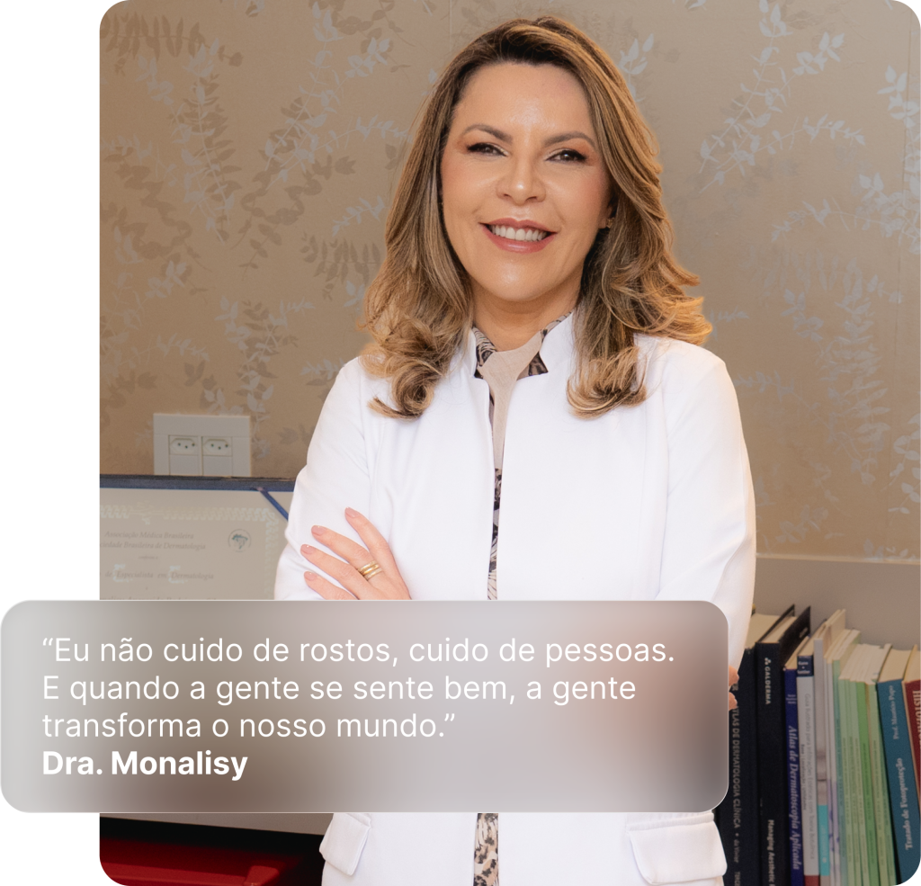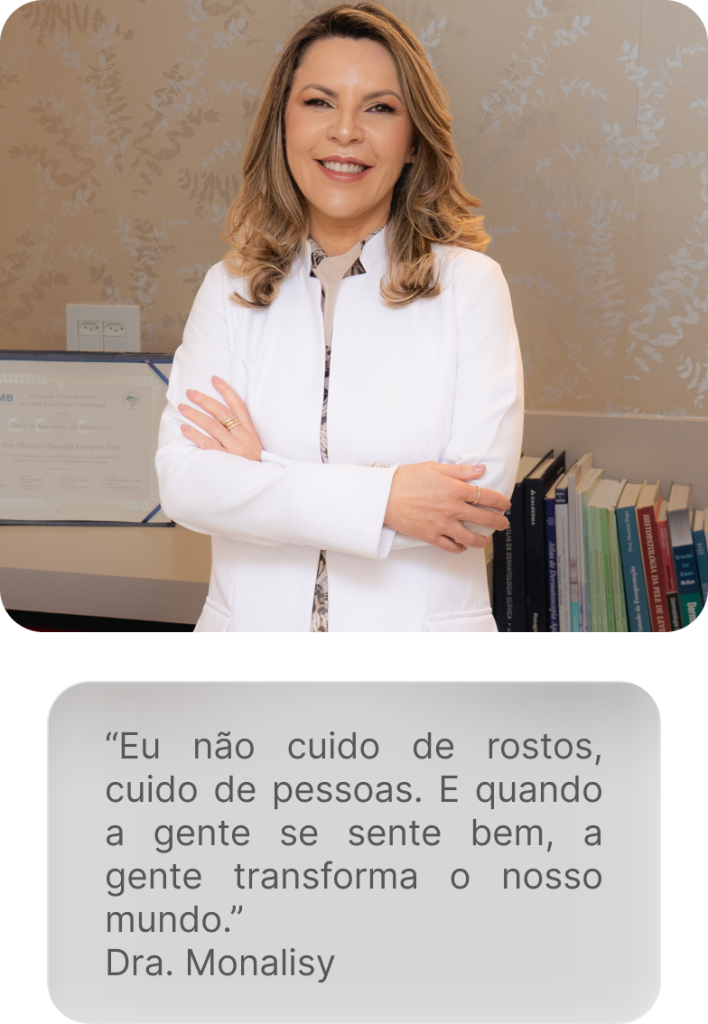 Com um olhar sensível, técnico e respeitoso, a Dra. Monalisy enxerga cada paciente como uma história diferente. Ela entende que, por trás de cada mancha, ruga ou queda de cabelo, existe uma mulher que quer voltar a se reconhecer no espelho, sem exageros, sem padrões inalcançáveis.